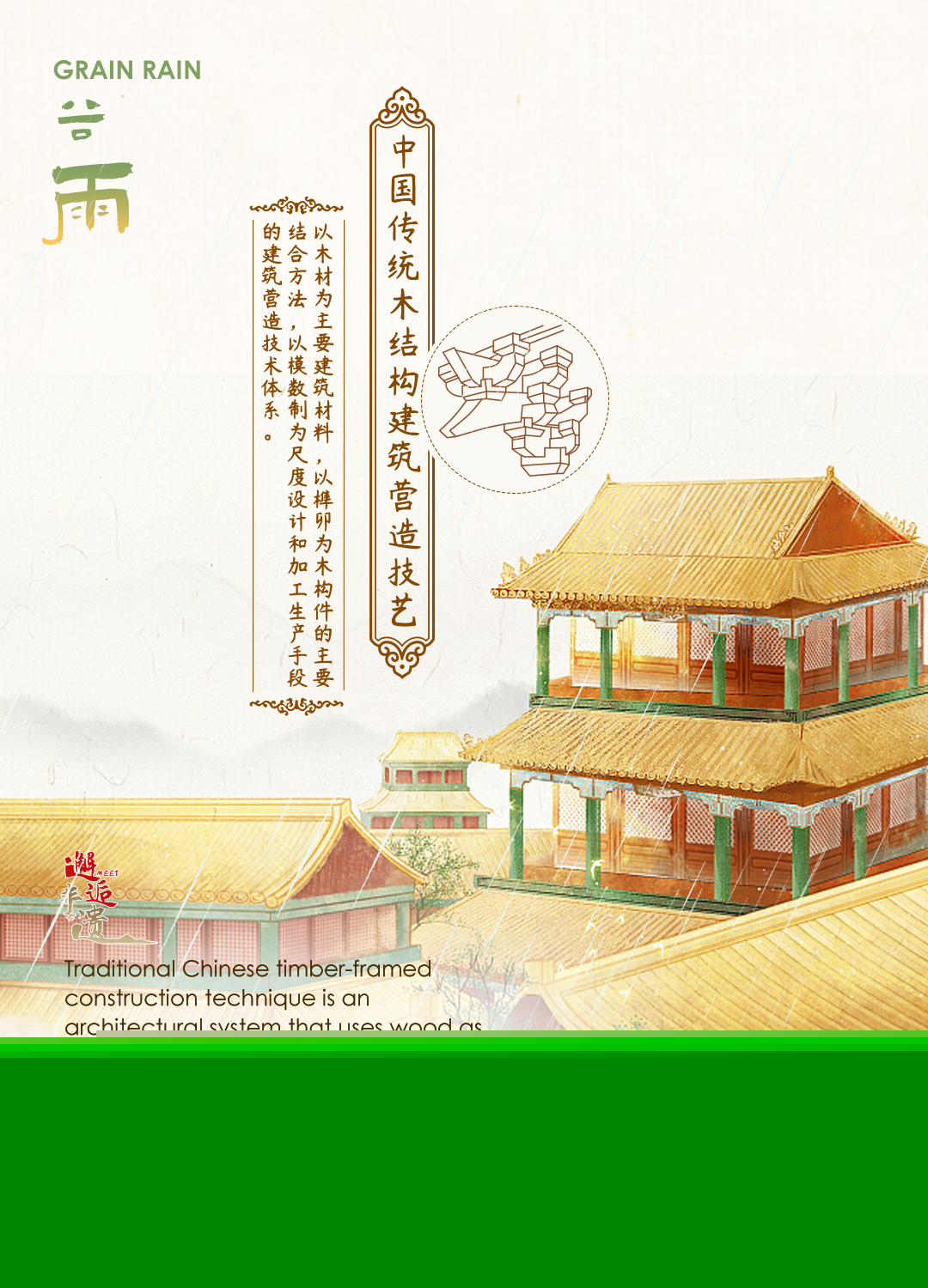 The traditional Chinese solar calendar divides the year into 24 solar terms. Grain Rain (Chinese: 谷雨),as the last term in spring, starts on April 19 and ends on May 4.