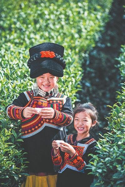 Girls from the Yi ethnic group hold cups of tea to welcome visitors to Casasa Village Resort. [Photo provided to China Daily]